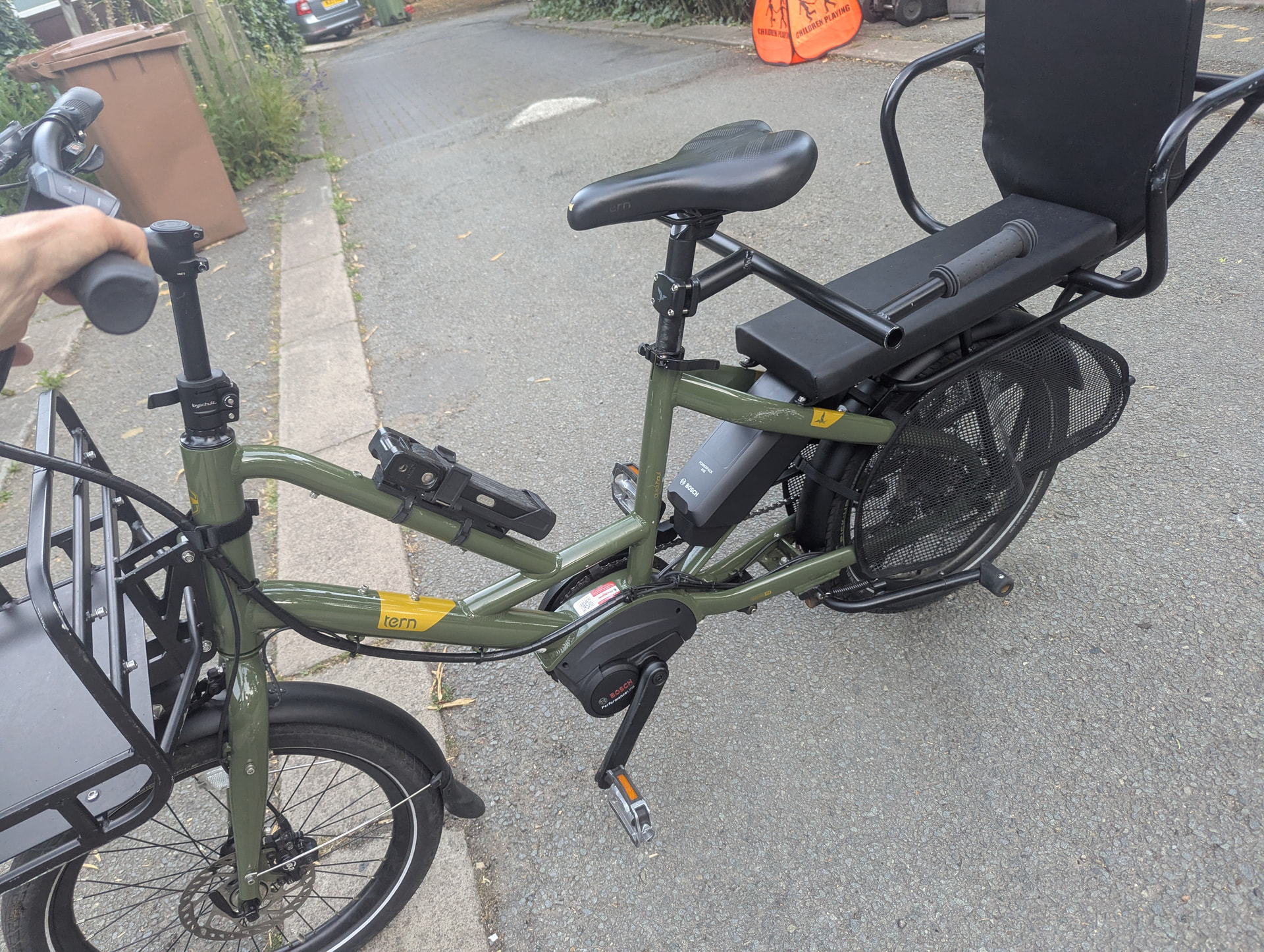 It is a green tern bike and would have been obvious if anyone was in the rec this afternoon between about 2.30 and 5 as there were tall gardening tools clearly sticking out of the pannier -