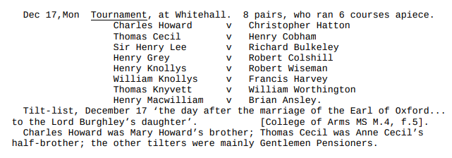 And sure enough here they are in a jousting tournament on Dec 17, 1571. The source is authoritive as it comes from the Folger Library which has one of the finest archives on Shakespearean documents in the world. Note that Brian Ansley is the spelling used here.