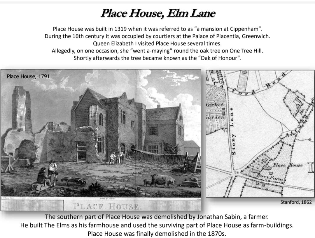 The first location we had examined (on Elm Lane) was the site of Place House also called Sydenham Place. The subject of this location and house is worthy of a pamphlet at the very least. But this slide from Steve Grindlay roughly captures the magnitude of the topic.